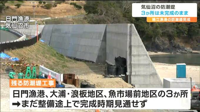 東日本大震災に伴い計画された宮城県の防潮堤整備工事について、昨年度で気仙沼市の鮪立漁港の整備が完了しました。一方、気仙沼市内の3か所は未完成のままで、完成時期も未定となっています。県によりますと、東…
