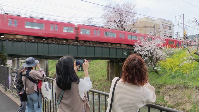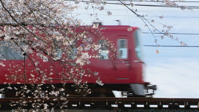 名鉄の赤い電車と、ピンク色のサクラが競演です。