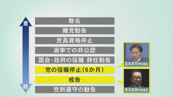 宮本議員は、8段階ある処分のうち、3番目に軽い「党の役職停止6か月」、岡田議員は2番目に軽い「戒告」の処分となりました。