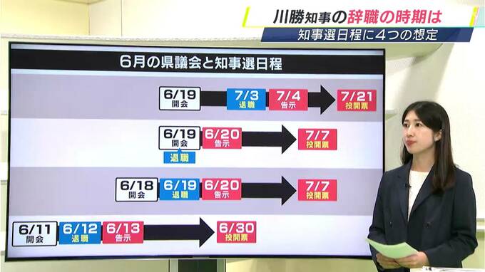 4月4日、県議会の代表者会議で示された四つの案です。知事は、もともと県議会の初日に辞意を表明したいとしていました。6月19日の開会日に退職となりますと、7月7日投開票という案が示されました。その1日前倒しの案、1週間前倒しの案が示されています。ただ、あまり後ろ倒しになると、静岡県政の停滞につながるので、今後も協議が進むとみられます。