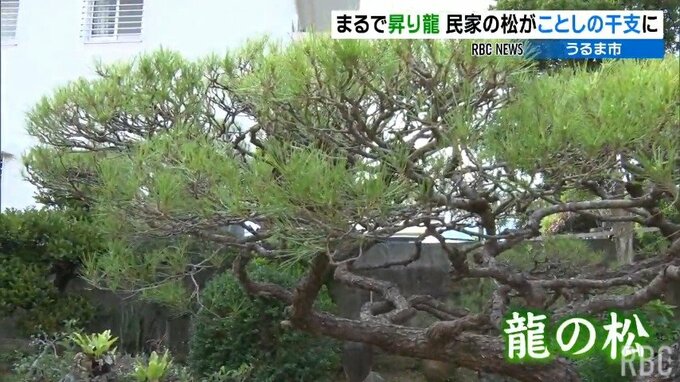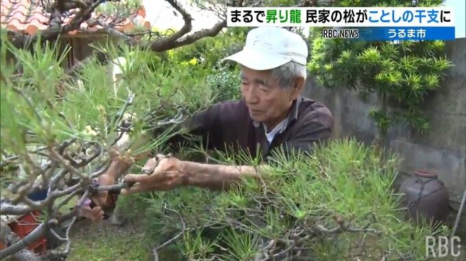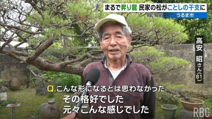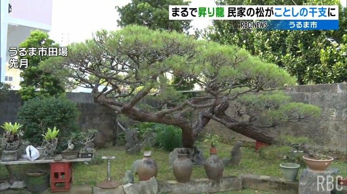 うるま市の民家で見事な枝ぶりの松の木が昇り龍のように見えると辰年の今年、地域を賑わせています。