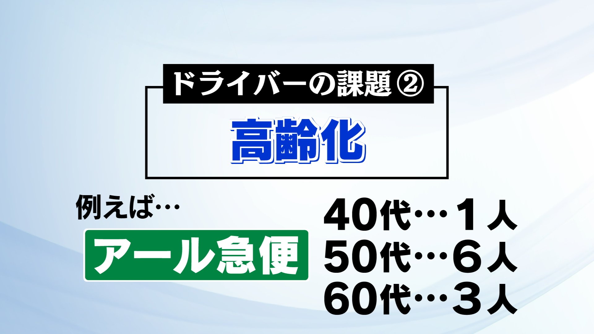 また、ドライバーの高齢化も、進んでいます。今回取材したアール急便のドライバー10人の年代は、40代が1人、50代が6人、60代が3人で、今後も人材の確保は課題の1つとなっています。鈴木社長も、時間外労働の規制により、「稼げない」というイメージがついてしまうと、若い人材の確保が難しくなるのではと、懸念しています。