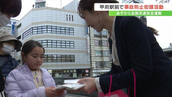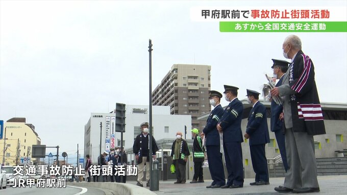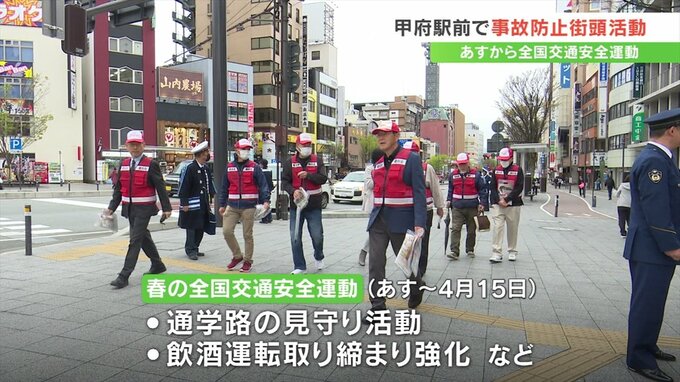 街頭活動は春の全国交通安全運動にあわせ実施したもので、警察や甲府市などから約50人が参加し、JR甲府駅前で安全運転や交通ルールを守ることを呼びかけました。