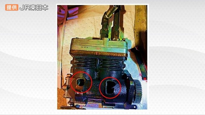 JR東日本によりますと、エンジンに付属するコンプレッサーに使われていたボルトが外れ脱落した部品によって内部が破損し油漏れにつながったということです。購入時点で不具合がある「初期不良のボルト」が使われていたということです。JR東日本は油が漏れた車両を含め同じ形式の工事車両を25台使っていますが、現在すべての使用を中止しています。7日までコンプレッサーのボルトを確認し異常がなければ使用を再開する方針です。