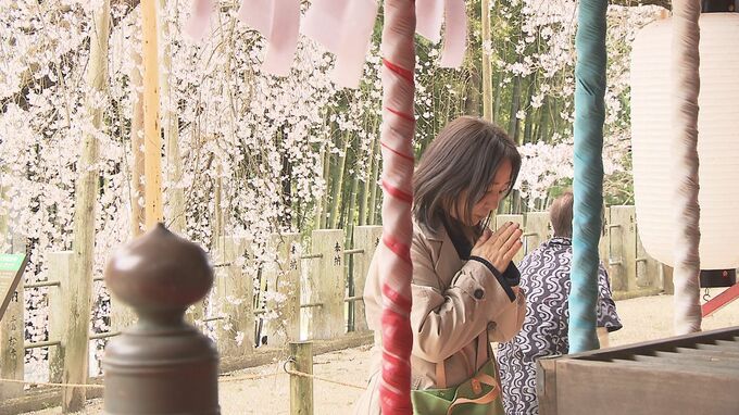 神社に寄り添い、高さおよそ12メートル、幹回りが3.6メートルもあるシダレザクラ。春の温かい日差しを浴びて、大きな枝からは数々の花が可憐に咲き競っています。