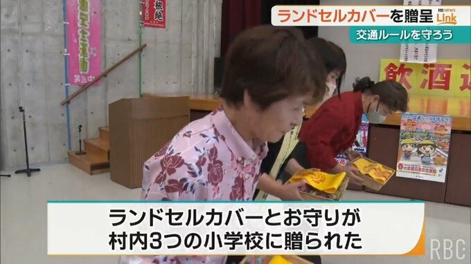 式では、宜野湾地区交通安全協会などからランドセルカバーとお守りが村内3つの小学校の校長に贈られました。