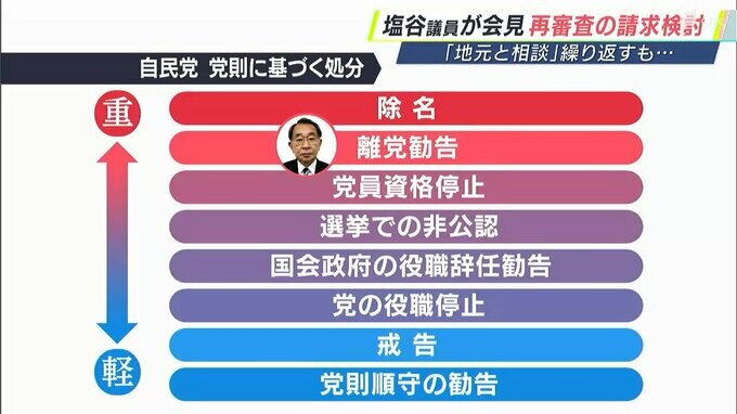 塩谷議員は、今回の処分について事実誤認のもとに決められたなどと主張。党全体の責任の取り方や政治倫理審査会の在り方などに疑義を呈しました。自民党の処分のうち「離党勧告」は2番目に重い処分です。離党勧告を受けた議員が自ら離党しない場合は除名処分になります。