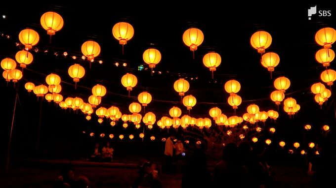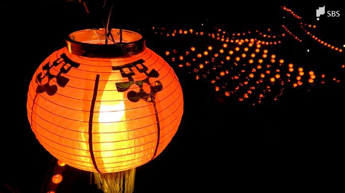ランタンの背後の空には花火が打ち上がり、ランタンをきれいに照らしていました。