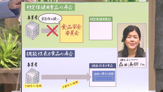 こうしたメリットの一方で、リスクが否めない部分もあるといいます。この制度の導入にあたって、消費者庁の検討会で委員を務めた森田さんは、「トクホの場合、食品安全委員会が厳しい審査を行い、安全性が疑われるものは許可しないが、機能性表示食品の場合、その審査がないので、製品に関する不都合な情報が見落とされたり、企業側が不都合な情報を届け出なかったりする可能性がある」と指摘します。