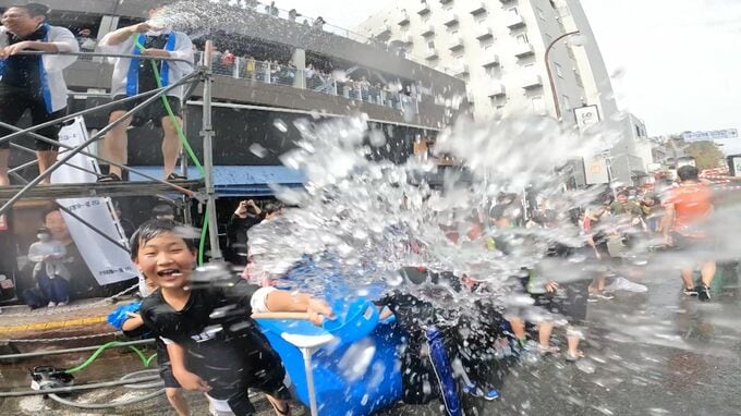 山口市・湯田温泉の湯をかけあう、恒例の「ぶっかけまつり」が7日あり、多くの人でにぎわいました。「ぶっかけまつり」は、湯田温泉白狐祭りのメインイベントのひとつで、今年で2回目の開催です。用意された湯田温…