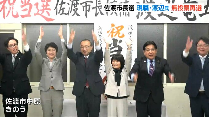 任期満了に伴う佐渡市長選挙が7日、告示され無投票で現職の渡辺竜五さんの再選が決まりました。市長選が無投票となるのは佐渡市発足後、初めてです。無投票で再選したのは現職の渡辺竜五さん59歳です。渡辺さんは…