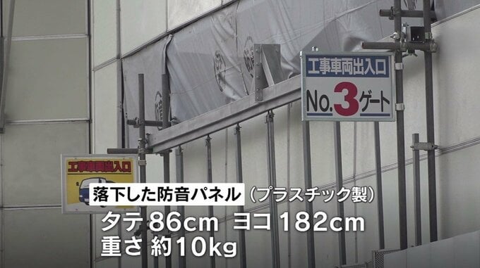 落下した防音パネルは、プラスチック製で縦86㎝、横182㎝、重さはおよそ10㎏だということです。