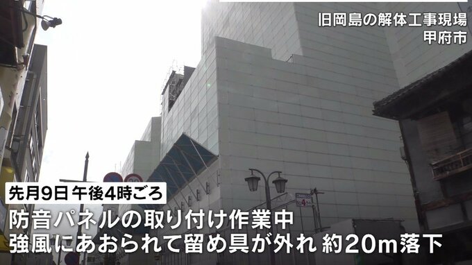 解体業者によりますと、3月9日午後4時ごろ、甲府市の旧岡島の解体工事現場で、防音パネルの取り付け作業をしていたところ、強風にあおられてパネルの留め具が外れ、およそ20m下に落下しました。