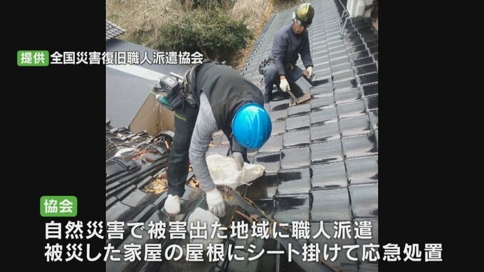 この協会は阪神淡路大震災をきっかけに、自然災害で被害が出た地域に職人を派遣し、被災した家屋の屋根にシートをかけて固定して応急処置をするボランティア活動を行っています。