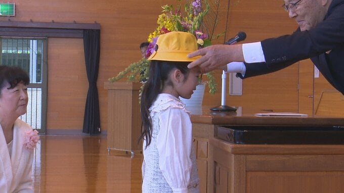 式では担任の先生から名前を呼ばれると元気いっぱいに返事をして、代表の児童に黄色い帽子が贈られました。