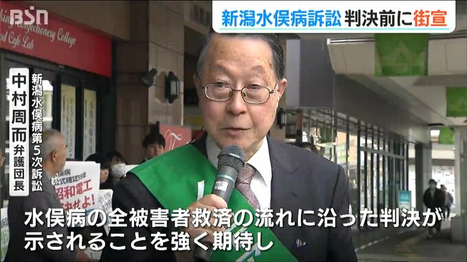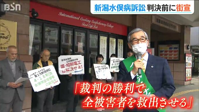 「新潟水俣病第5次訴訟」の判決を前に行われた街頭宣伝。原告団長の皆川栄一さんや弁護団らが「裁判の勝利で全被害者を救出させる」と訴えました。