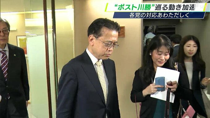 知事選に向けた動きが一気に表面する中、自民党会派は緊急の会合を開き、知事の辞表提出に伴う選挙の日程を共有したうえで、候補擁立に向けてスピード感をもって動くことを共有したということです。