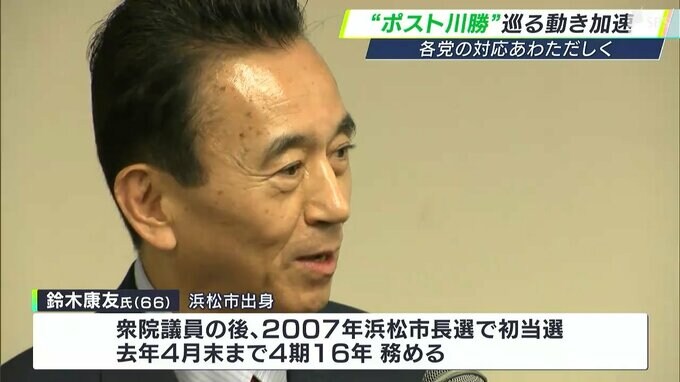 関係者によりますと浜松市の経済界の一部が政令市の市長としての経験や知名度がある鈴木氏に打診したということです。鈴木さんは4月8日、SBSの取材に対し「現在、情報収集中で前向きに熟慮している」とコメントしています。