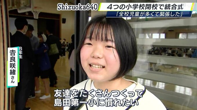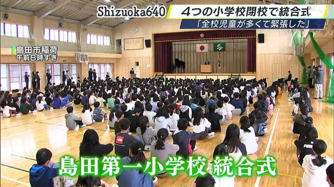 静岡県島田市では3月、4つの小学校が閉校し、子どもたちが新たに通う島田第一小学校では4月8日朝、統合式が行われました。