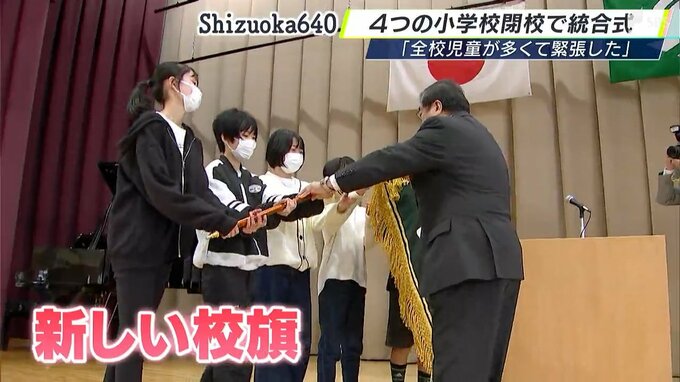統合式では、島田市の山中教育長が新しい校章が入った校旗を代表の児童に手渡しました。
