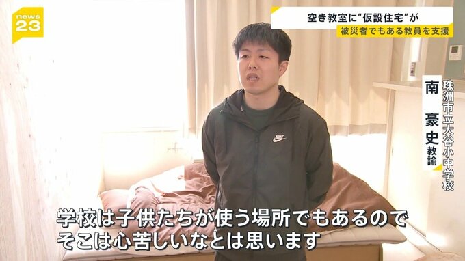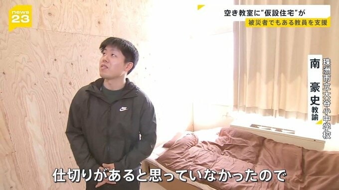 入居する1人、南豪史先生は2か月あまりにわたり職員室で寝泊まりしながら勤務を続けてきました。