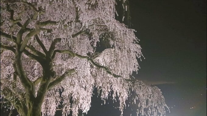 山梨市牧丘町にある乙ヶ妻(おっかづま)のシダレザクラが満開となり、ライトアップされて幻想的な姿を見せてくれています。