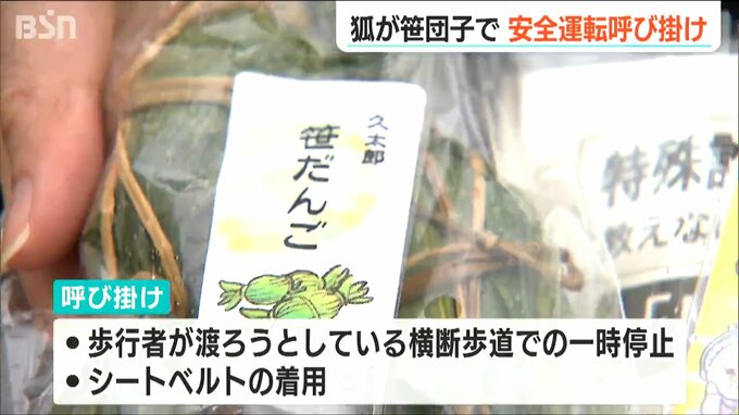 歩行者が渡ろうとしている横断歩道での一時停止を呼びかけたほか、新潟銘菓・笹団子のようにギュっとシートベルトを締めてほしいと、地元で作られた笹団子を配りました。