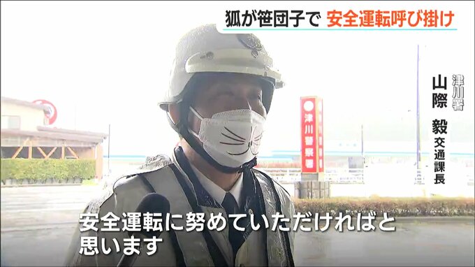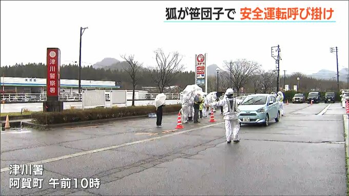 春の全国交通安全運動の一環として9日、新潟県 阿賀町でキツネの格好をした警察官らが交通安全を呼び掛けました。