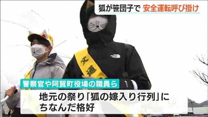 警察官や阿賀町役場の職員らは地元の祭り『狐の嫁入り行列』にちなんで、キツネの格好をしています。