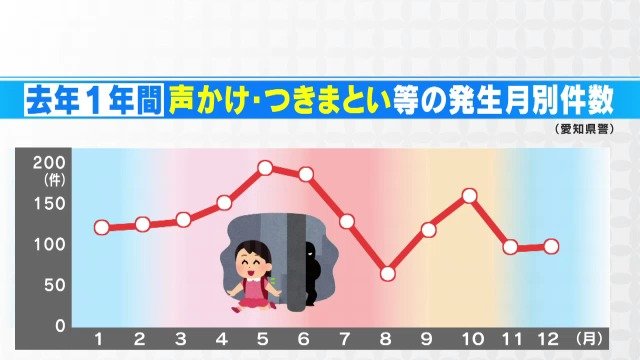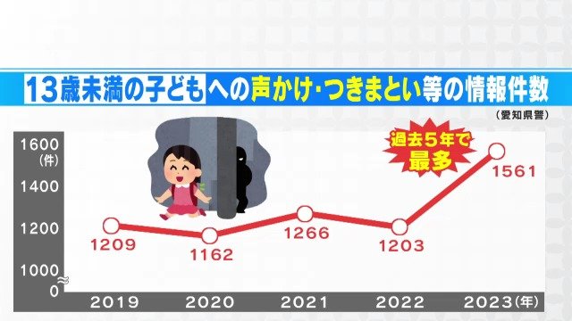 愛知県警によりますと、県内の警察に寄せられた13歳未満の子どもに対する「声かけ」や「つきまとい」などの情報の件数は、去年1年間で1561件もありました。