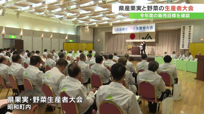 山梨県産の果実と野菜の生産者が一堂に集まり今年度の目標を確認する生産者大会が、昭和町で開かれました。