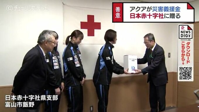 義援金は2月と3月に行われたホームゲーム後に選手たちが観客らに募金を呼びかけて集めたもので、富山と石川の被災地に贈られます。