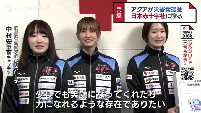 日本赤十字社富山県支部を訪れたのはアクアフェアリーズの中村安里副キャプテンら4人で、布野浩久事務局長に義援金42万6246円を手渡しました。