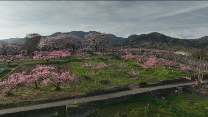 サクラと桃の花が咲き誇る山梨県内の公園の映像をお届けします。