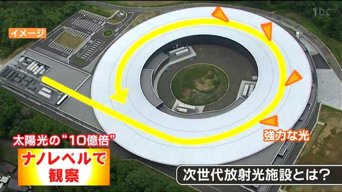 なぜドーナツ型をしているのかというと、建物の中では、電子が光と同じような速さで回転。電子が方向を変える際、太陽の10億倍の明るさを持つ、「放射光」と呼ばれるX線を発生させます。このX線で、物質を1メートルの10億分の1というナノレベルで観察できる世界最高水準の研究施設です。