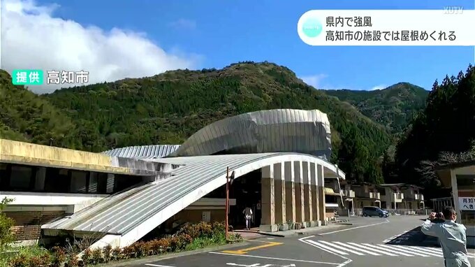 高知市土佐山にある健康福祉センターでは午前9時ごろ、金属製の屋根が半分以上めくれあがりました。破片の一部が風で飛散し、敷地内の車に当たるなどしましたが、けが人はいません。