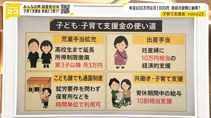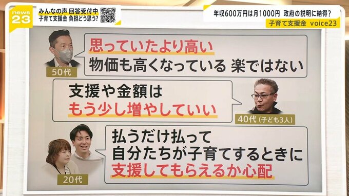 皆さんの意見はさまざまありまして、「思っていたよりも高い」「もう少し増やしてもいいんじゃないかな」と、皆さん状況も違いますからね。「自分たちが子育てするときに将来支援してもらえるか心配」こんな声も出てきています。