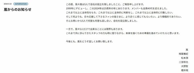 10日、アイドルグループ「嵐」がメンバー5人の連名で、新会社の設立を発表しました。