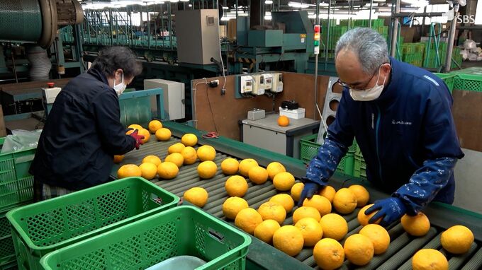 静岡県河津町では4月10日、地元で収穫された甘夏の初出荷が行われました。10日は、甘夏の仕分け作業がありました。人の目と機械によって、色や形、大きさが選別され、約2.5トンの甘夏が箱詰めされました。