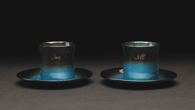 コーヒーカップのセットは、黒と青の漆をグラデーションに重ね、バイデン夫妻のファーストネームが蒔絵の技法で刻まれています。