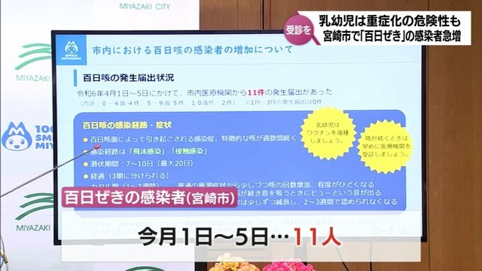 特徴的な咳が数週間続く感染症「百日ぜき」の感染者が宮崎市で急増しています。乳幼児が感染すると重症化することもあり、市は早めの受診やワクチン接種を呼びかけています。「百日ぜき」は特徴的な咳が数週間続き…