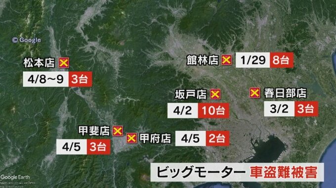 ビッグモーターでは今年1月、群馬県で8台、3月と4月は埼玉県の2店舗で13台、4月9日は長野県松本市の店舗で3台の盗難が判明しています。