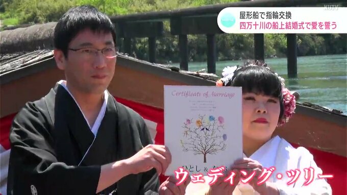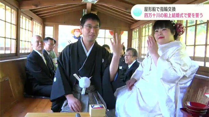 船上結婚式は四万十川の自然の中で思い出に残る式を挙げてもらおうと四万十市の屋形船業者と美容室などの共同企業体、『四万十D&H』が毎年行っています。20回目の節目の今回、13組の応募から選ばれたのは四万十市出身で現在は愛媛に暮らす、本山整(もとやま・ひとし)さん(40歳)と奈緒(なお)さん(34歳)夫婦です。2人は四万十川に浮かぶ屋形船で指輪の交換などを行い愛を誓いました。