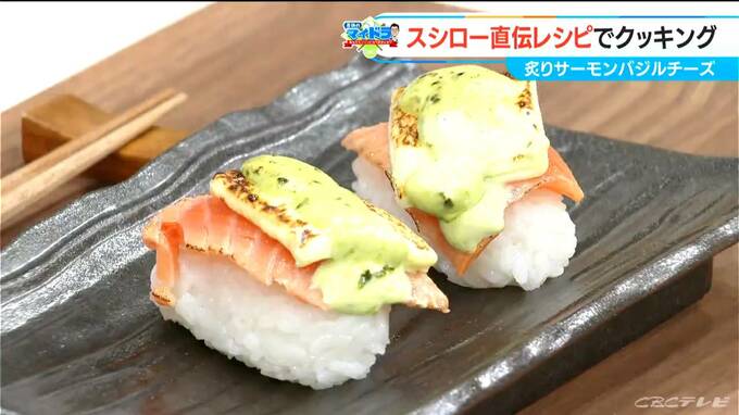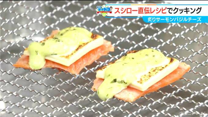 本物が食べたいなという方は、ぜひスシローさんに行ってください。炙りサーモンバジルチーズ出来上がりです!。では、いただきます。