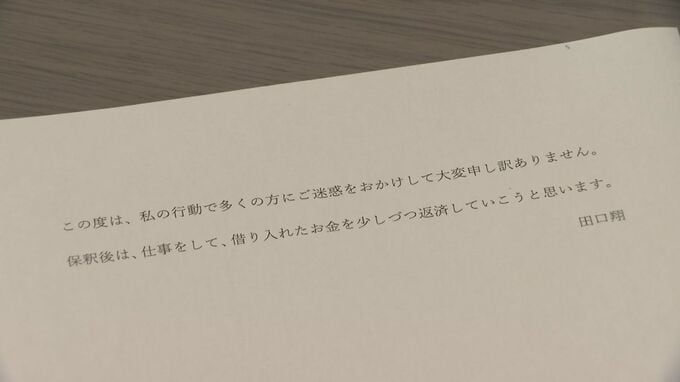 「このたびは、私の行動で多くの方にご迷惑をおかけして大変申し訳ありません。保釈後は仕事をして、借り入れたお金を少しずつ返済していこうと思います。田口翔」