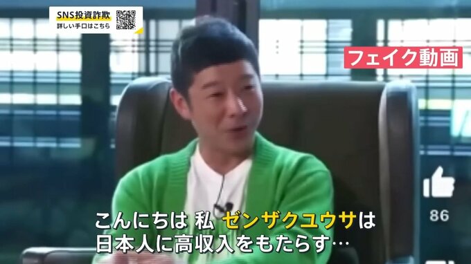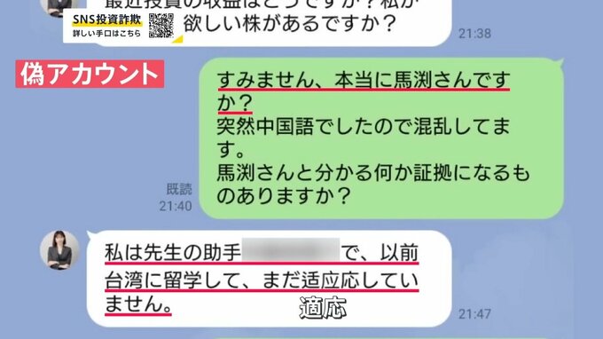 前澤友作さんのフェイク動画では、「私ゼンザクユウサは…」と、名前が全く違うものになっていたり、経済アナリスト・馬渕磨理子さんを名乗る偽LINEには中国語で文章が送られてきたりします。