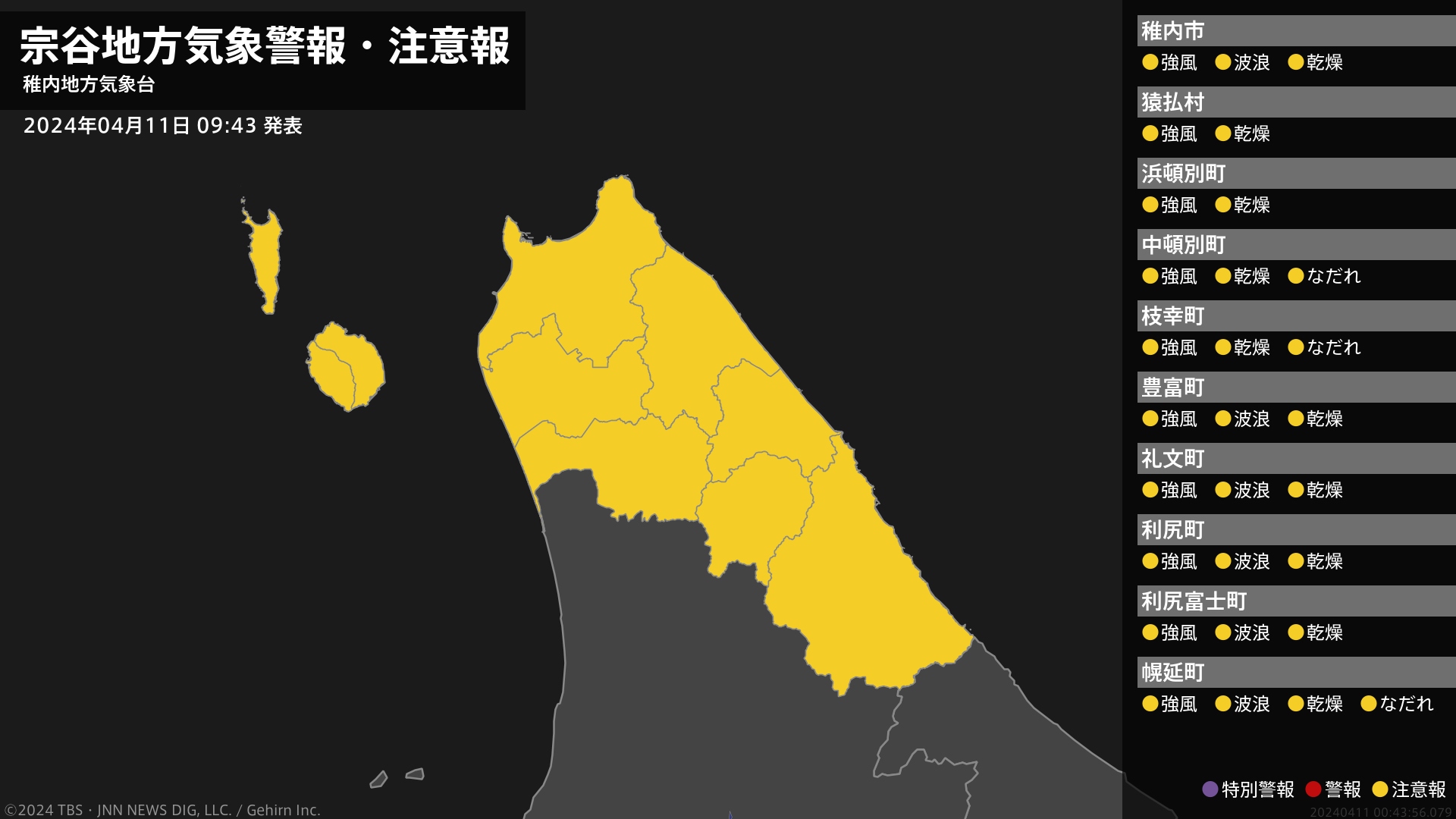 気象台は、午前9時43分に、なだれ注意報を中頓別町、枝幸町、幌延町に発表しました。