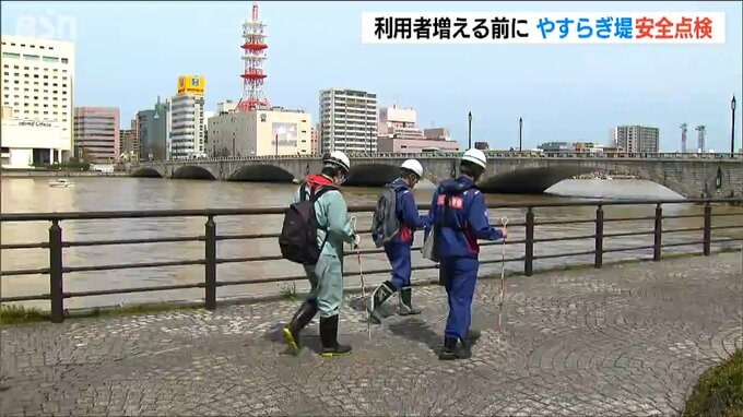 これからの時期、利用者が増える新潟市のやすらぎ堤で11日、国土交通省の職員らが安全点検を行いました。安全点検が行われたのは、信濃川沿いのやすらぎ堤です。11日、信濃川下流河川事務所と新潟市の職員らおよそ3…