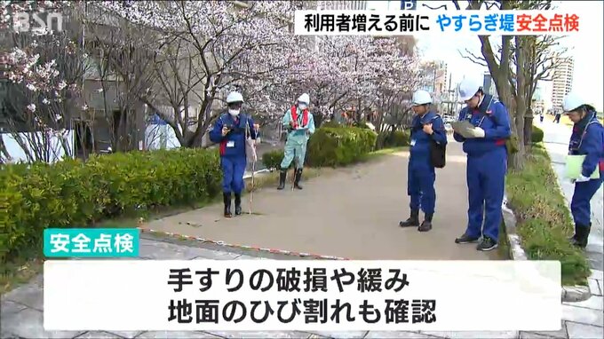これからの時期、利用者が増える新潟市のやすらぎ堤で11日、国土交通省の職員らが安全点検を行いました。