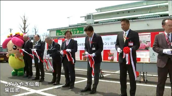 「JAみやぎ仙南」には、カーネーションの生産者など関係者が集まり、テープカットをしてゆうパックの初出荷を祝いました。